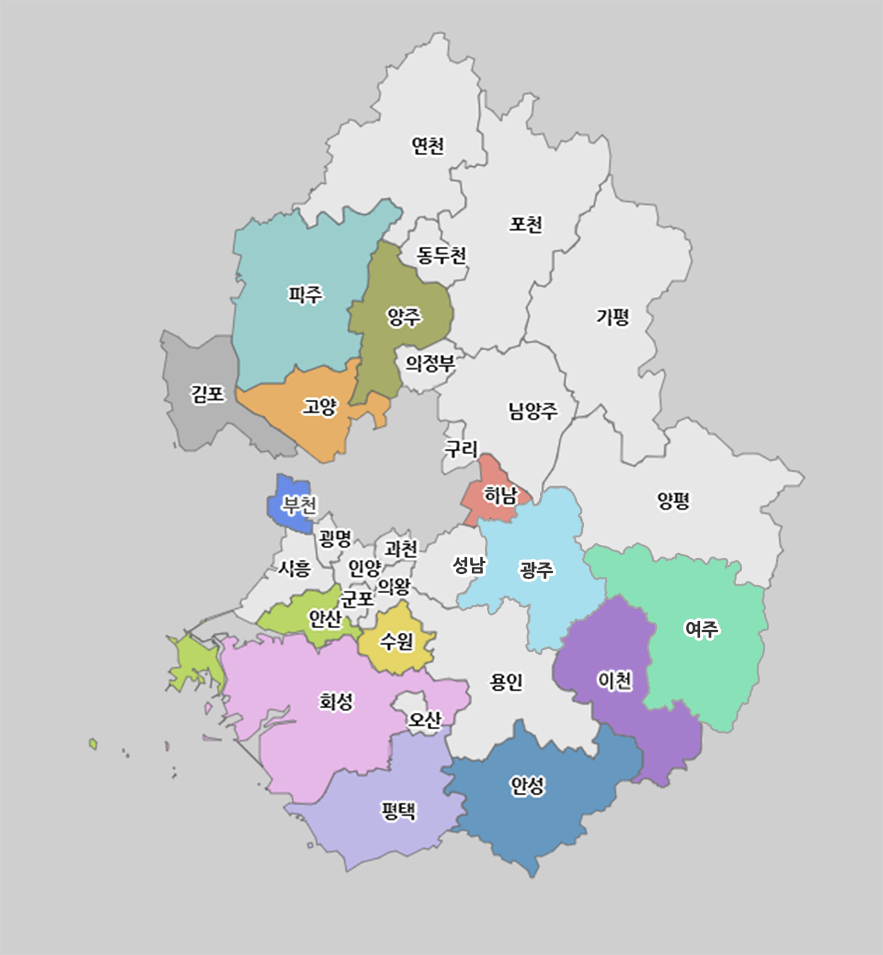 - 안성시 : 서부지역(공도읍, 양성면, 원곡면) , 동부지역(삼죽면, 죽산면, 일죽면), 보개면, 금광면